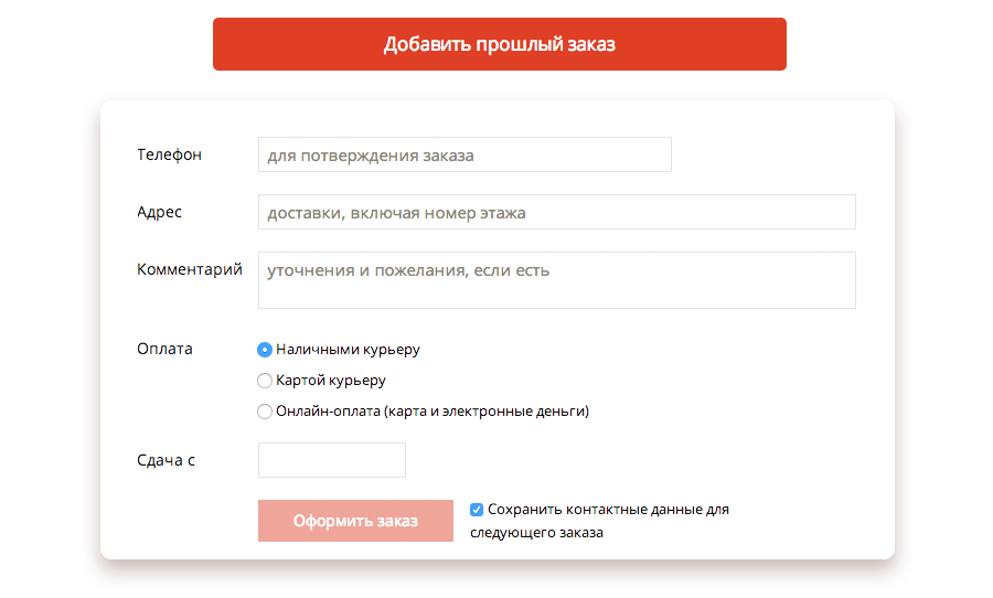 Для заказа нужно заполнить всего два обязательных поля — телефон и адрес. Это настолько очевидно, чтобы мы даже не стали ставить около них звёздочки.