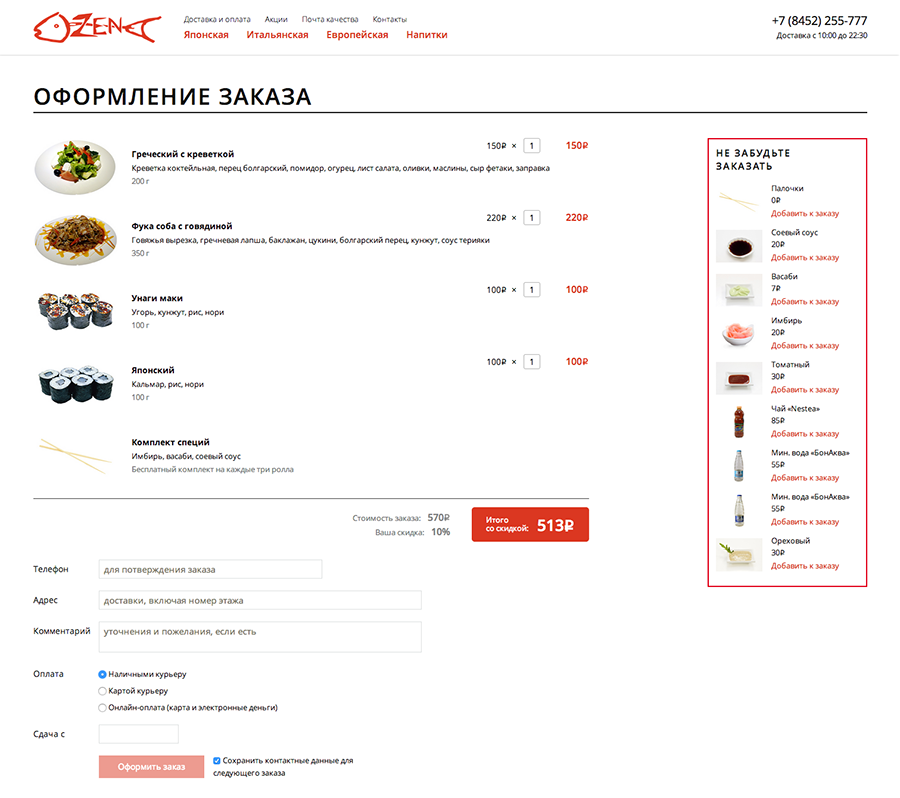 Сайт запоминает ваш последний заказ для быстрого повтора по кнопке в корзине, а также информацию о доставке.Повторный заказ — до 10 раз быстрее!