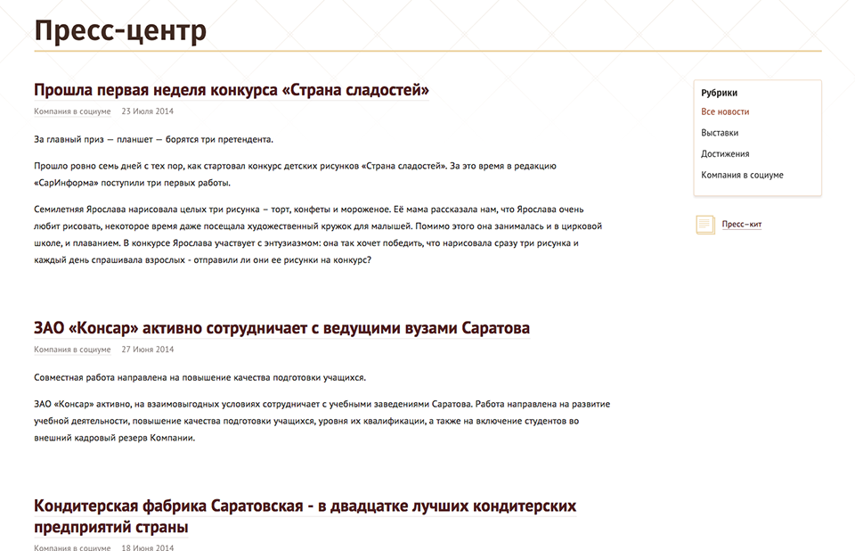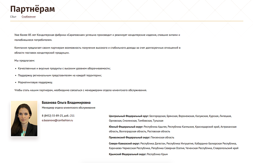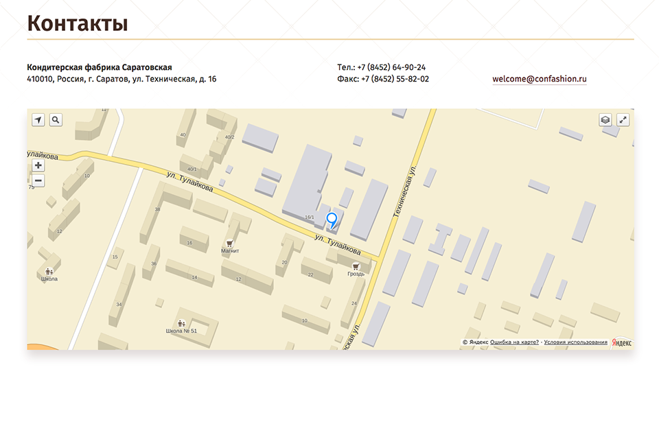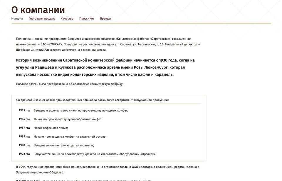 Предыдущий сайт кондитерской фабрики Саратовская, работающей под брендом Confashion был разработан 10 лет назад в 2005 году, и перестал работать в 2012, по неизвестным нам причинам, поэтому сайт проектировался и разрабатывался с нуля.