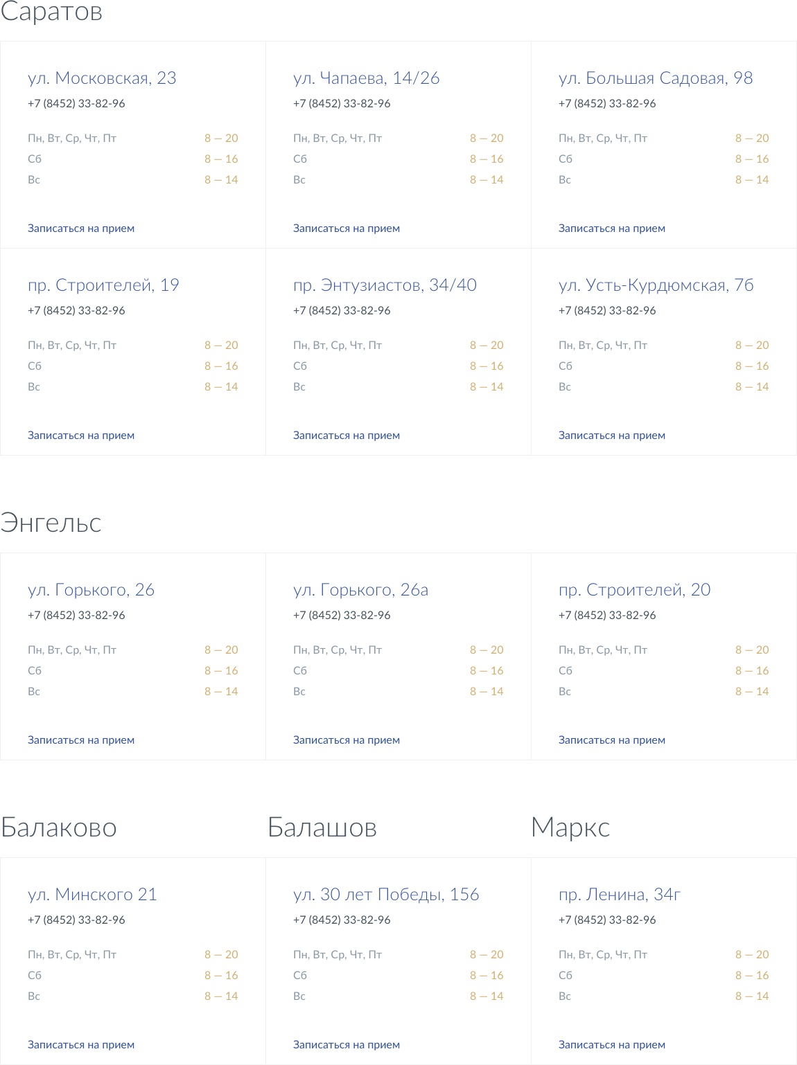 Клиники группируются по городам, для каждой указано время работы по дням недели.