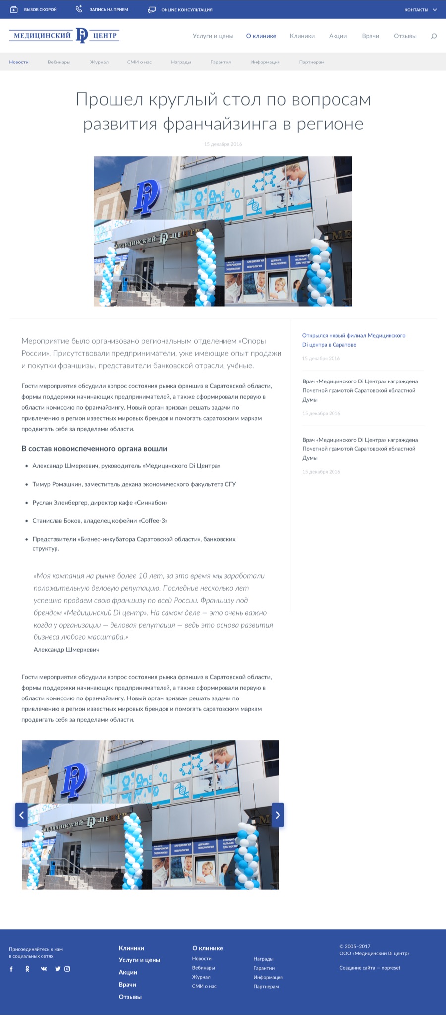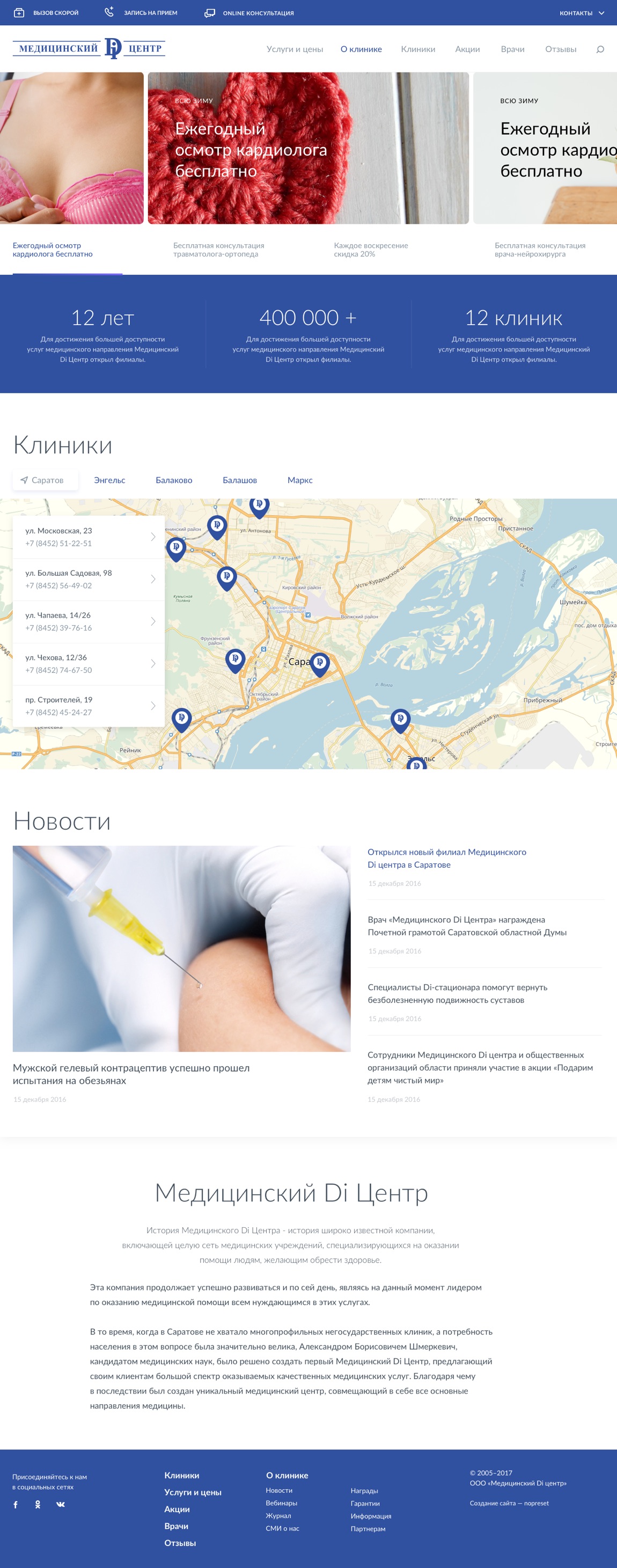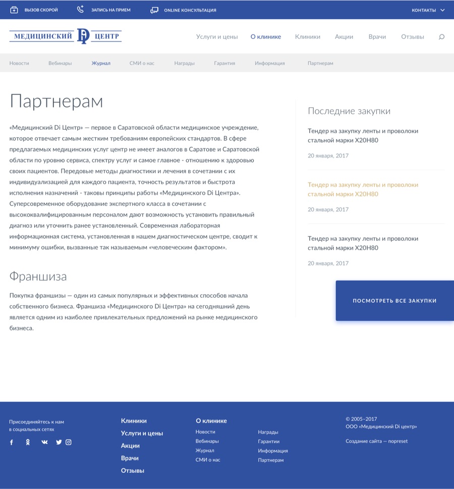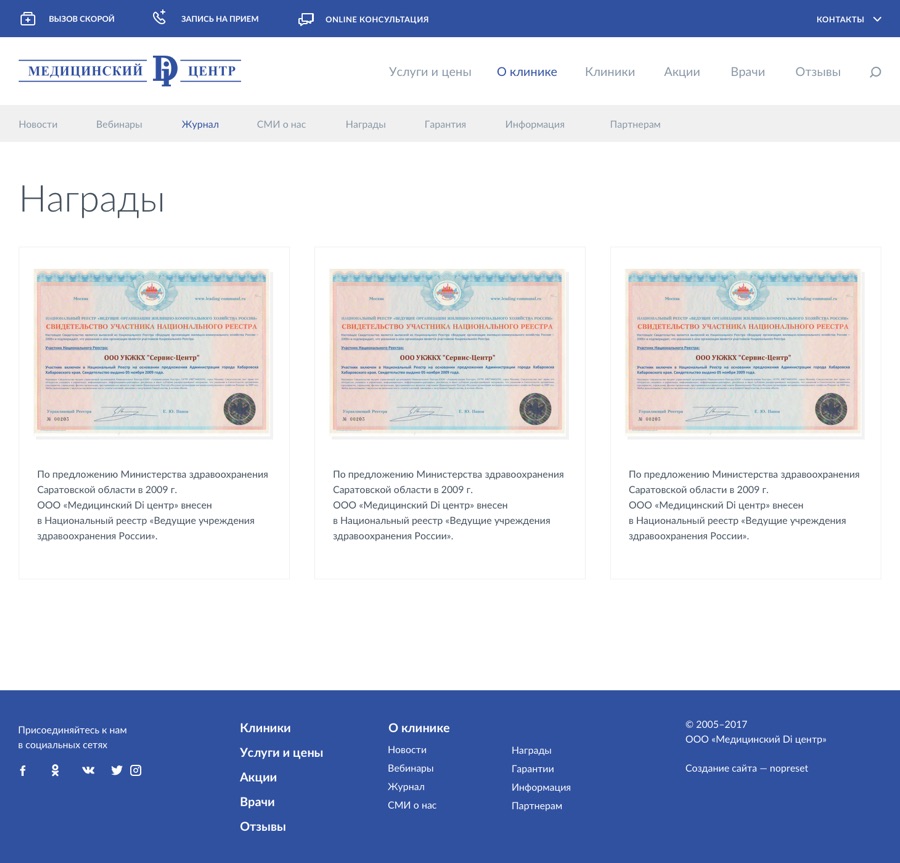 На странице клиники привязаны все врачи и услуги, а также лицензии и сертификаты.