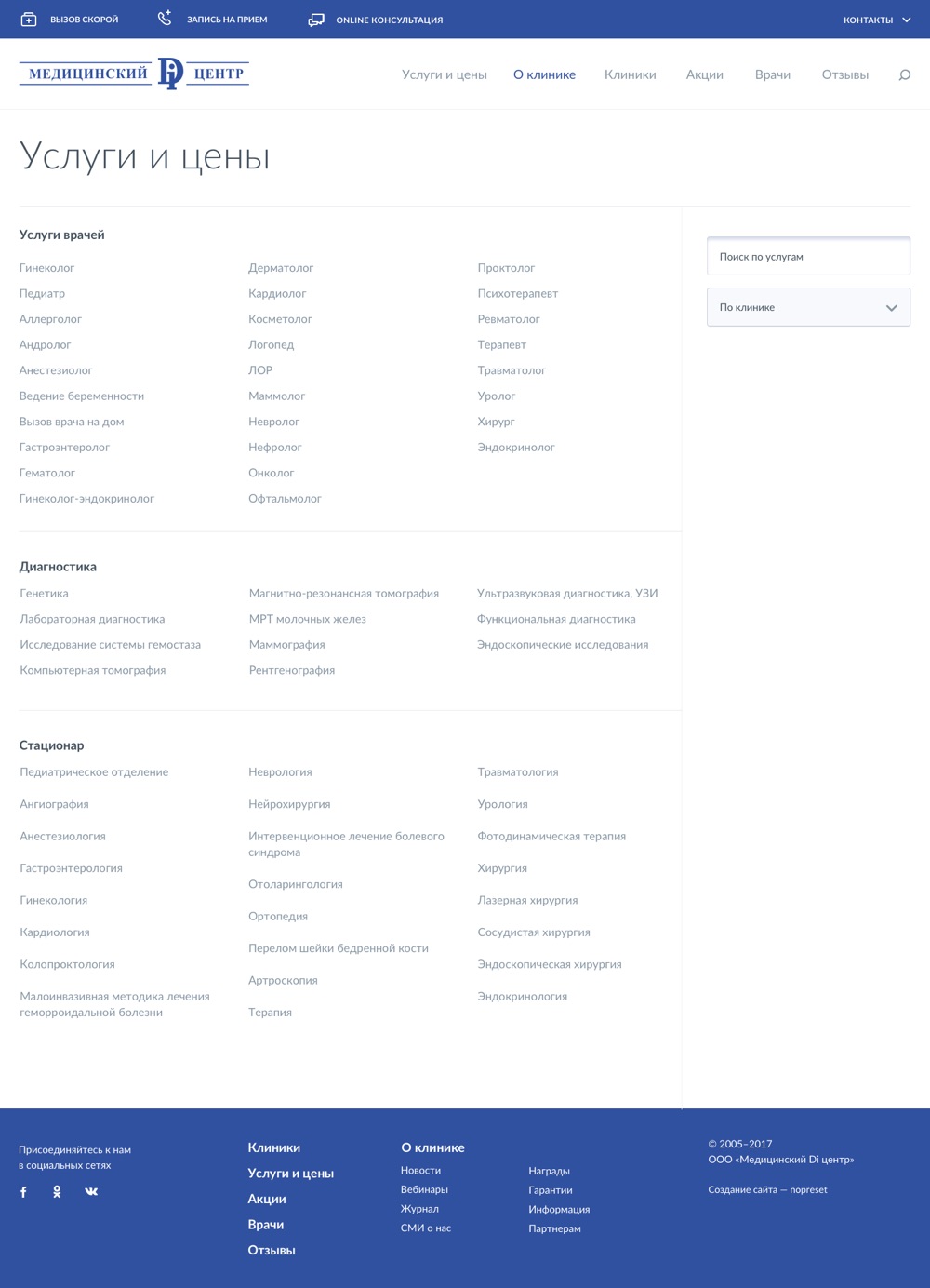 Услуги фильтруются по клиникам, есть быстрый поиск на странице услуг.
