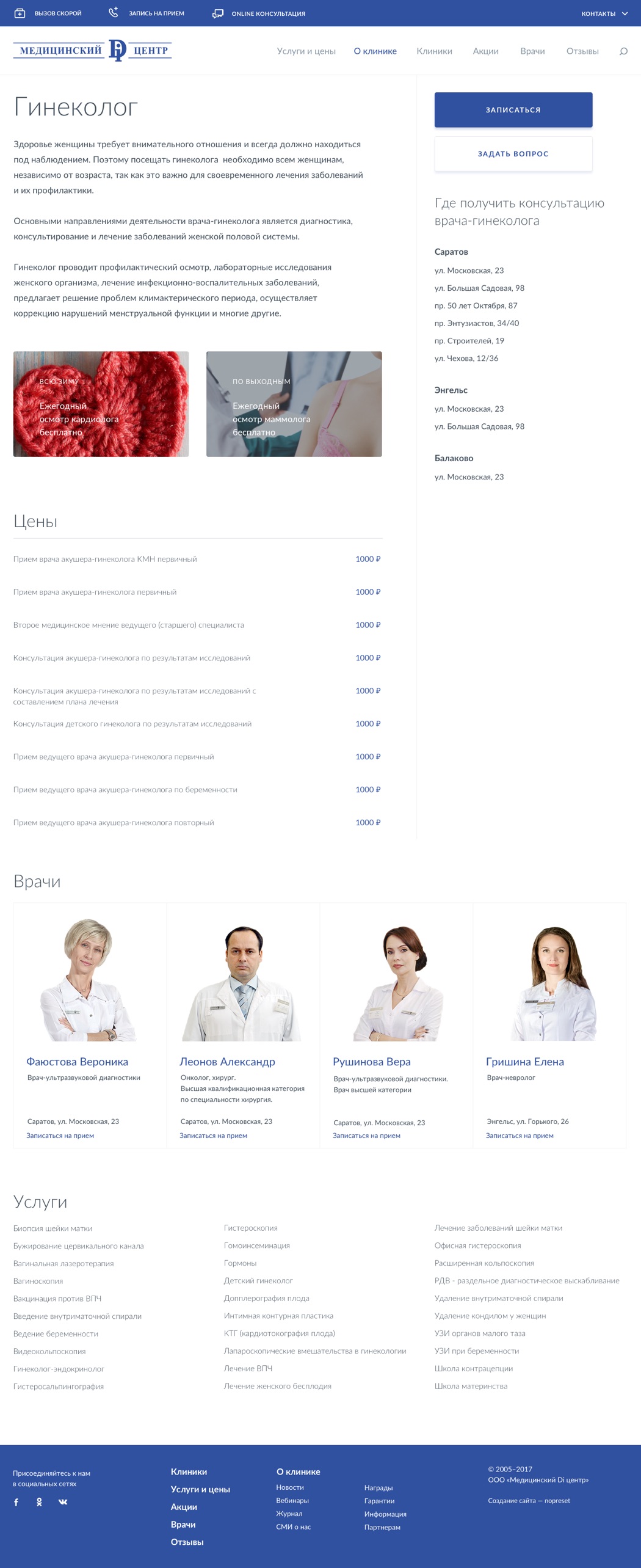 На странице услуги указаны клиники где она оказывается, цены на услуги и врачи, которые их оказывают.