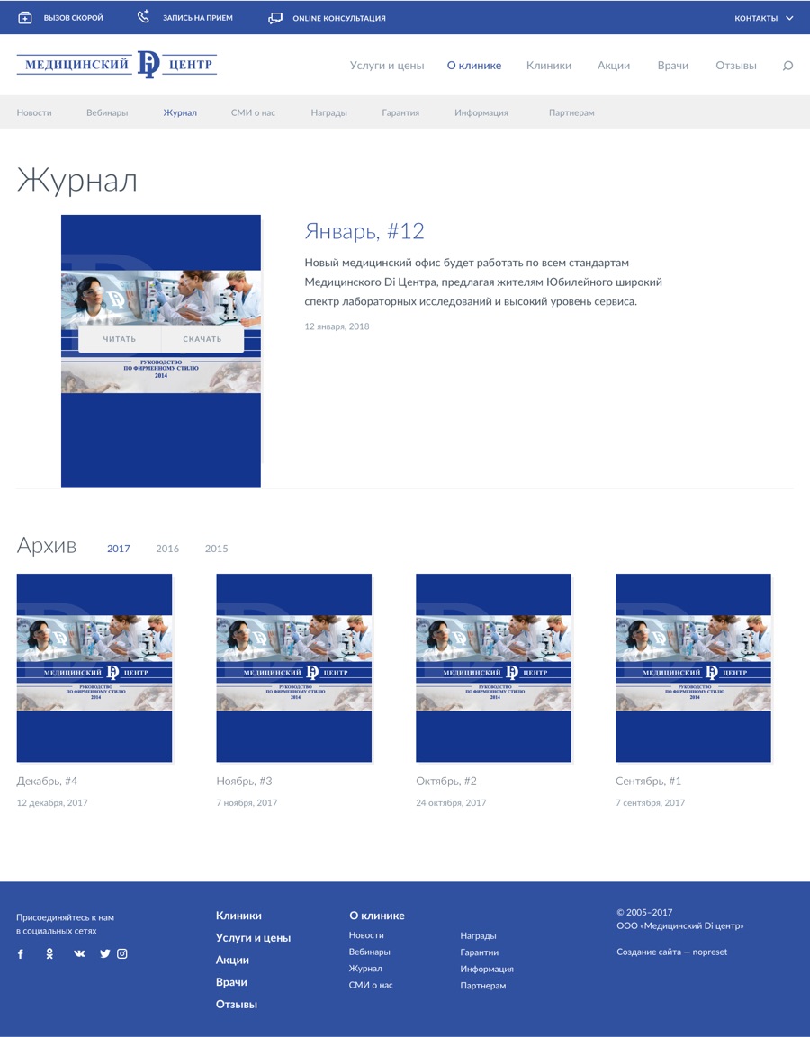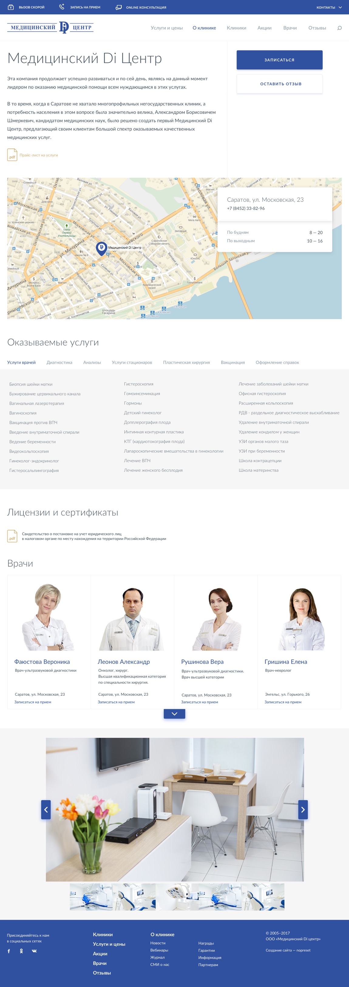 На странице клиники привязаны все врачи и услуги, а также лицензии и сертификаты.