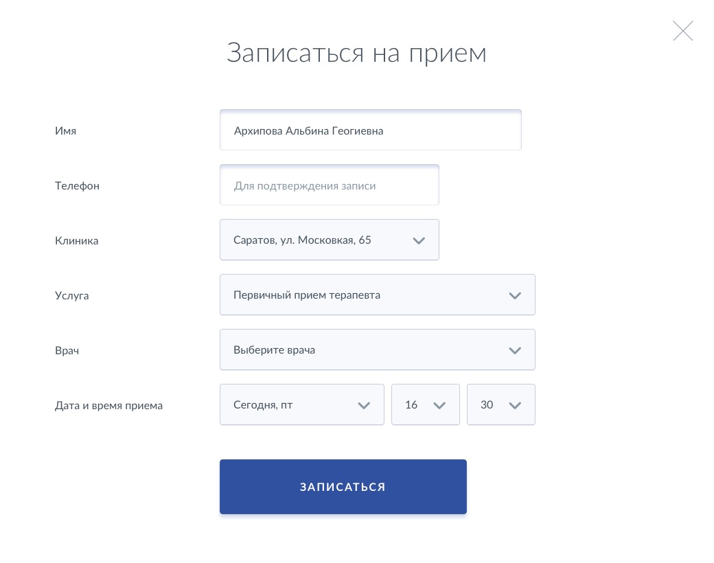 Услуги фильтруются по клиникам, есть быстрый поиск на странице услуг.