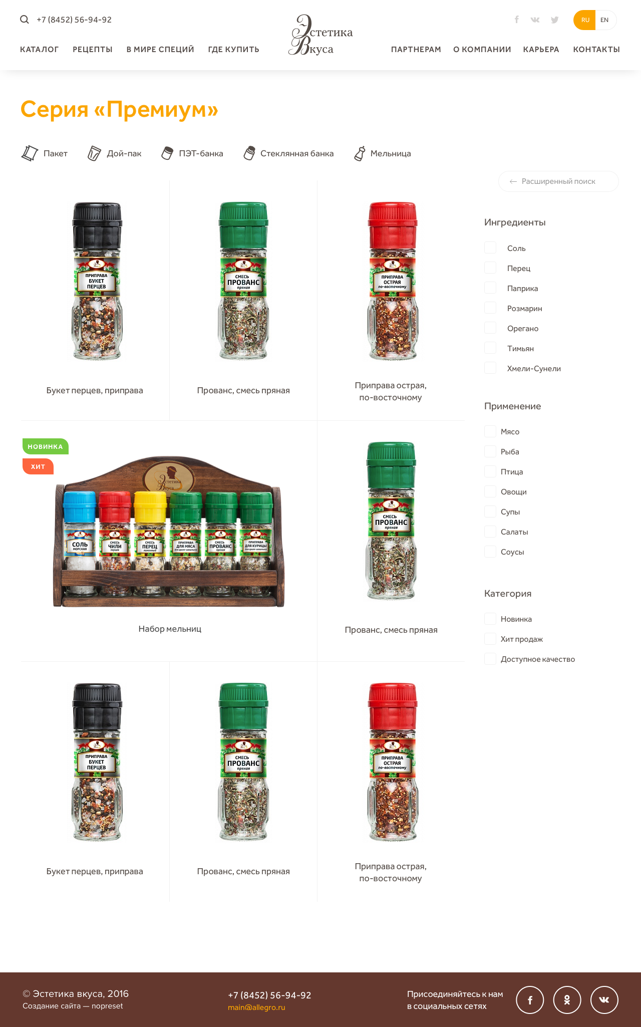Фильтры по типу упаковки, ингредиентам, применению в блюдах, ориентированы как на потребителей, так и на партнёров компании.