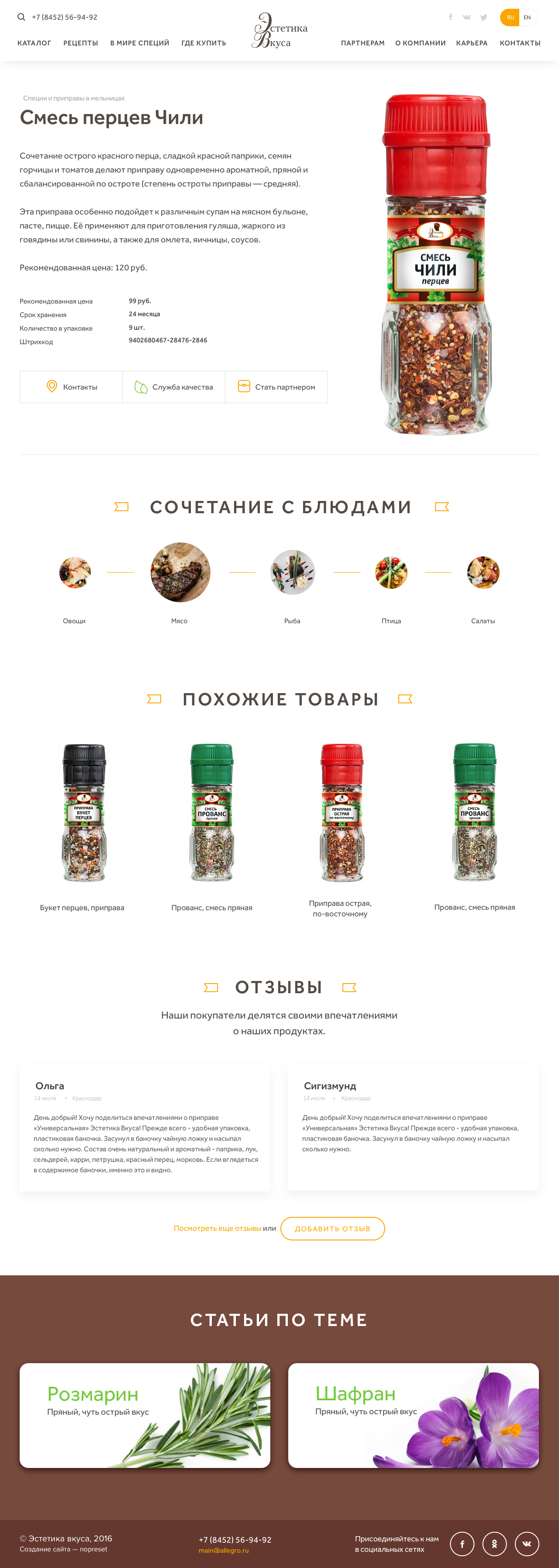 Информация о товаре включает краткое описание и характеристики. Блок визуальной связи с блюдами, со ссылкой на рецепты. Блоки с похожими товарами, отзывами и связанными статьями.