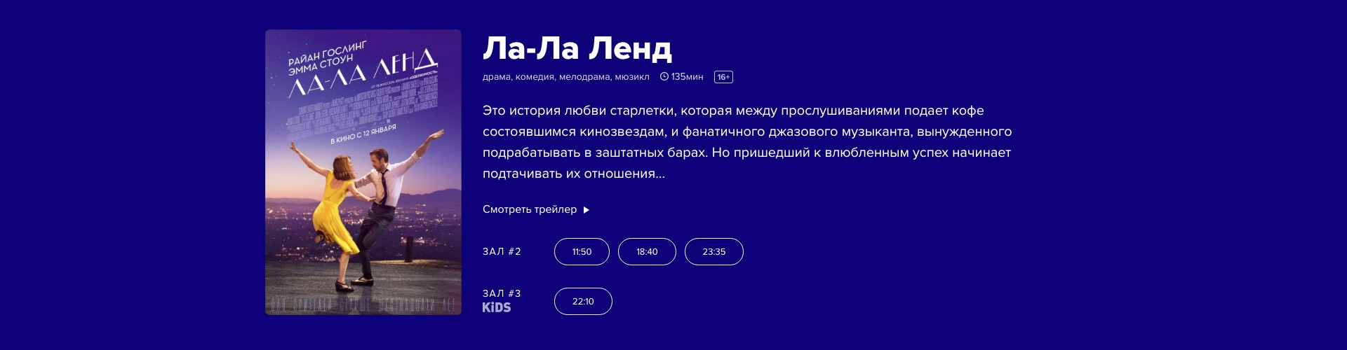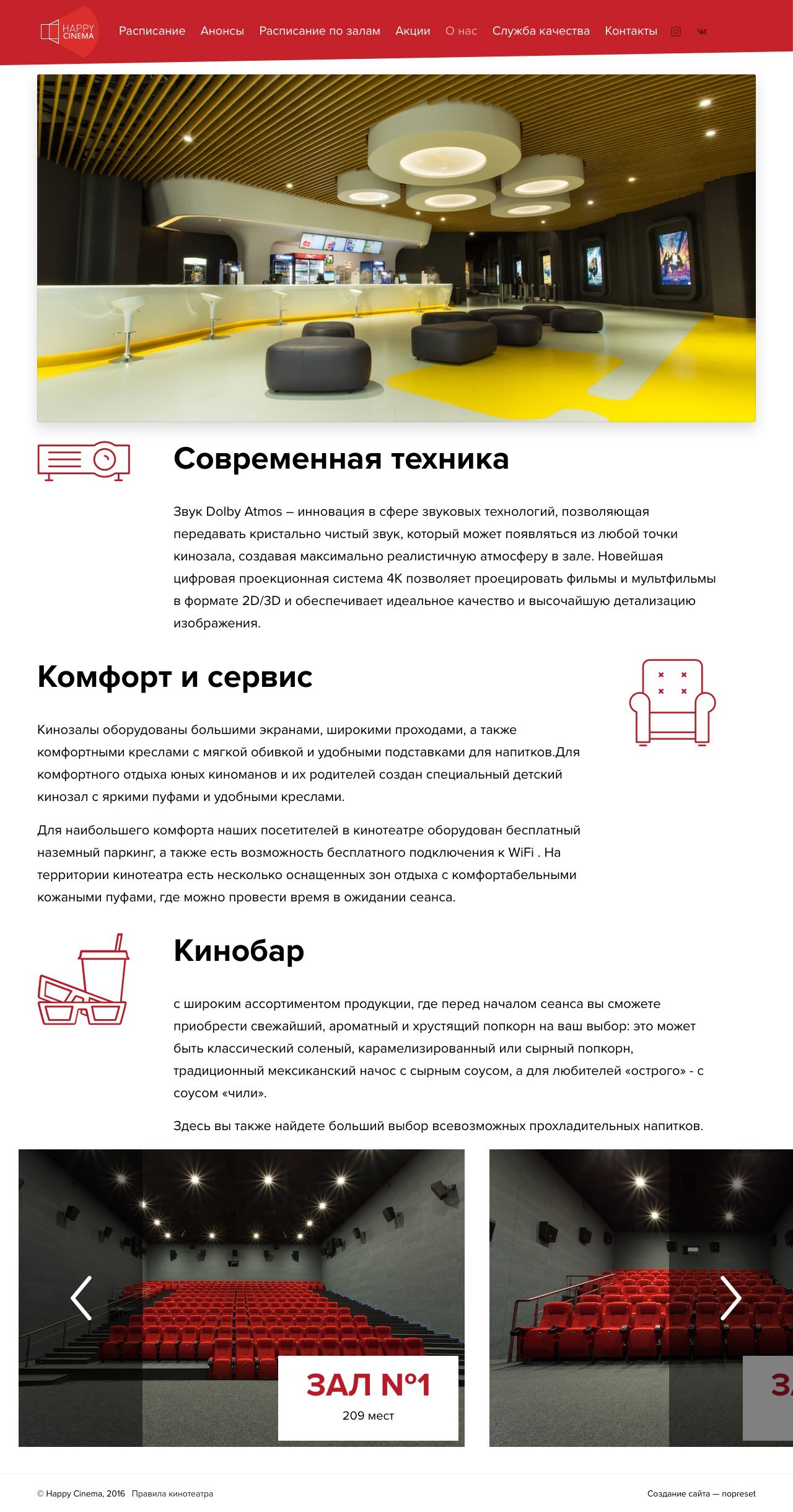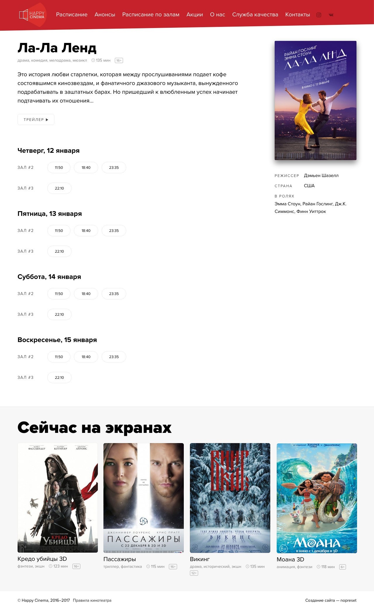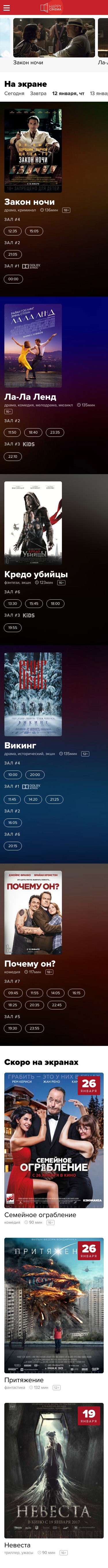 Также были разработаны: расписание по залам и времени, анонсы, страница фильма с полным расписанием, страница о кинотеатре, акции, контакты и несколько других служебных страниц.