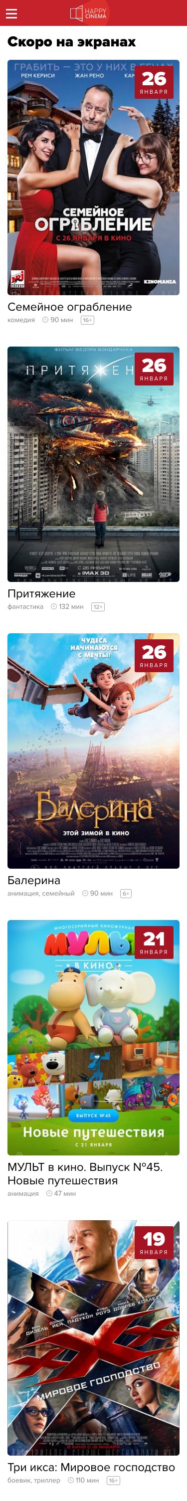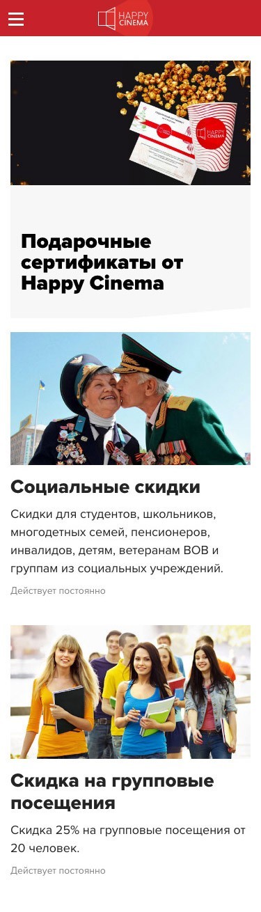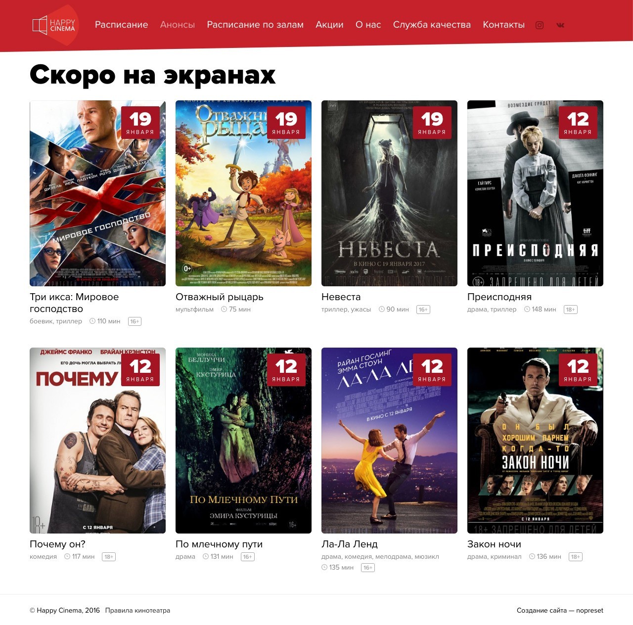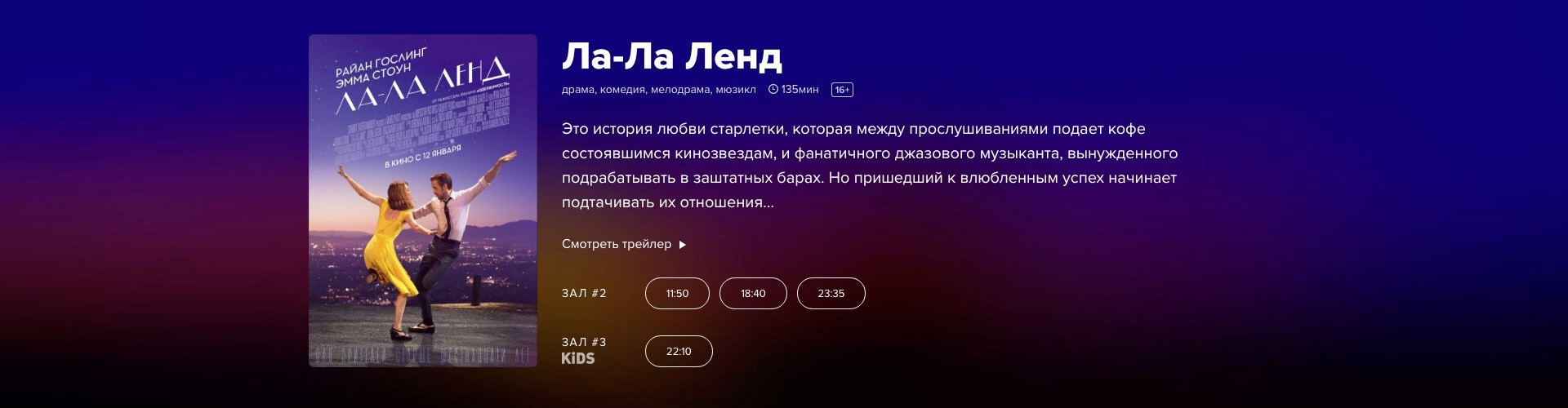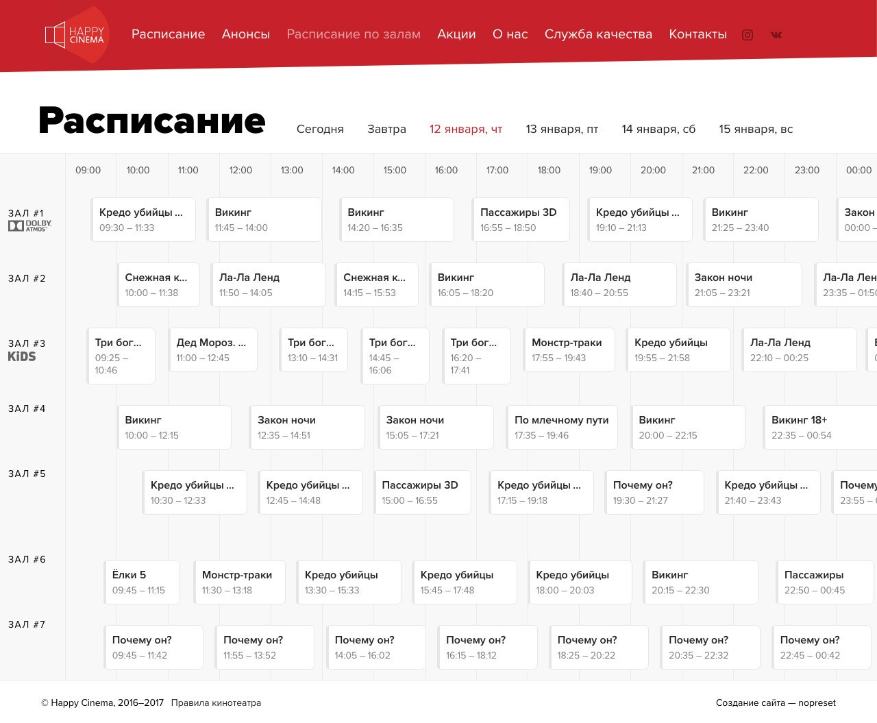Также были разработаны: расписание по залам и времени, анонсы, страница фильма с полным расписанием, страница о кинотеатре, акции, контакты и несколько других служебных страниц.