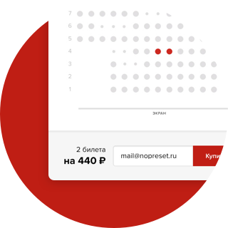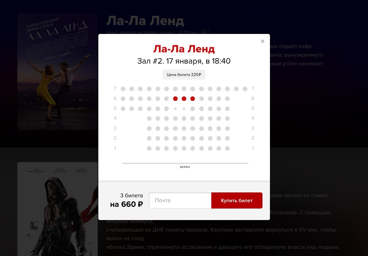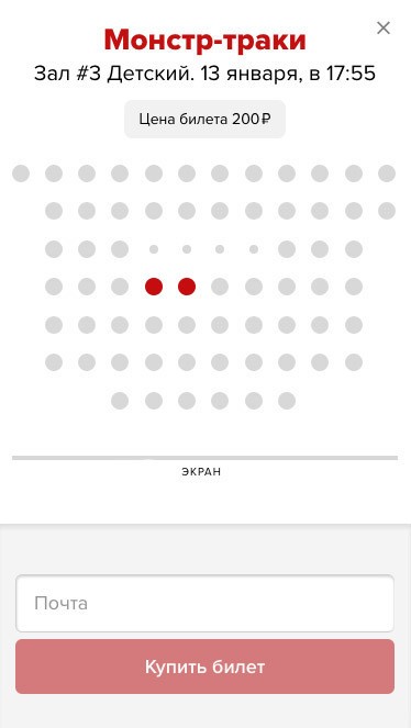 По клику на сеанс появляется всплывающее окно со схемой зала, где можно выбрать места и перейти к оплате заказа.