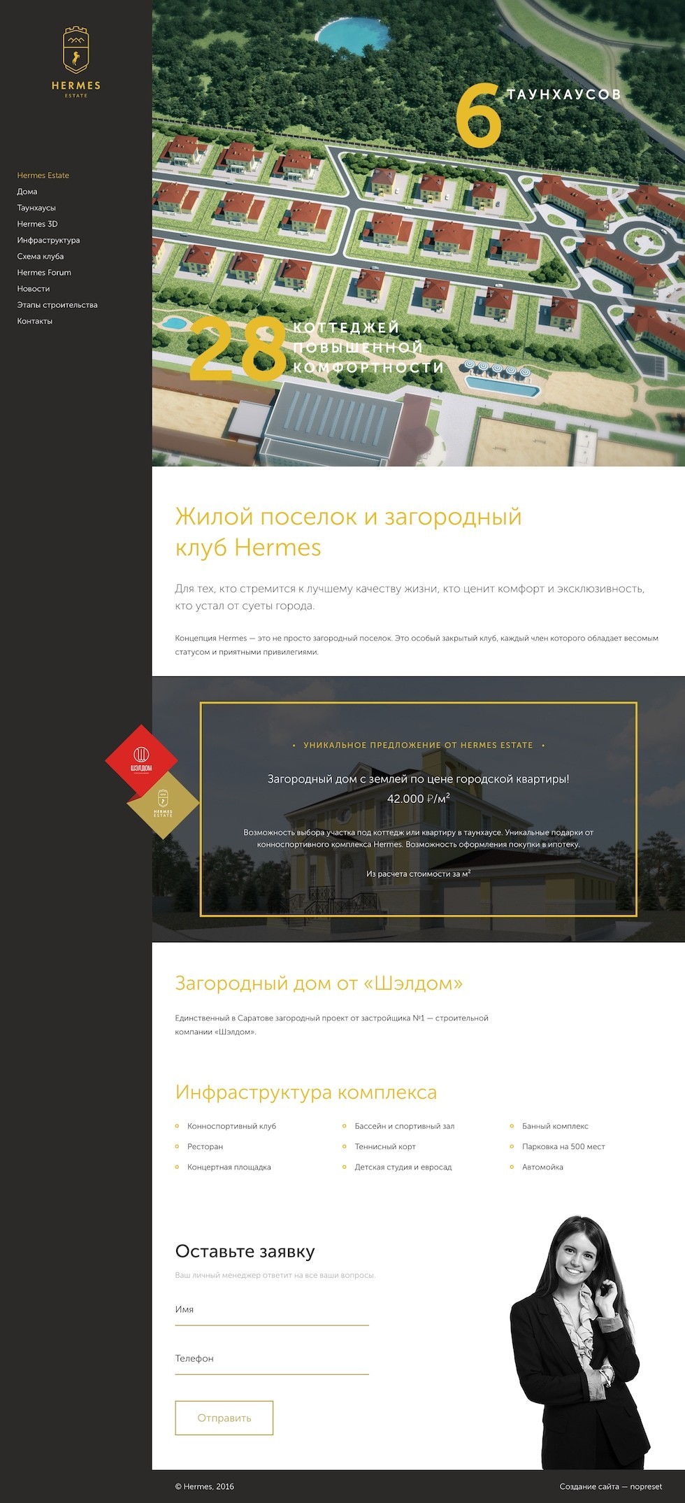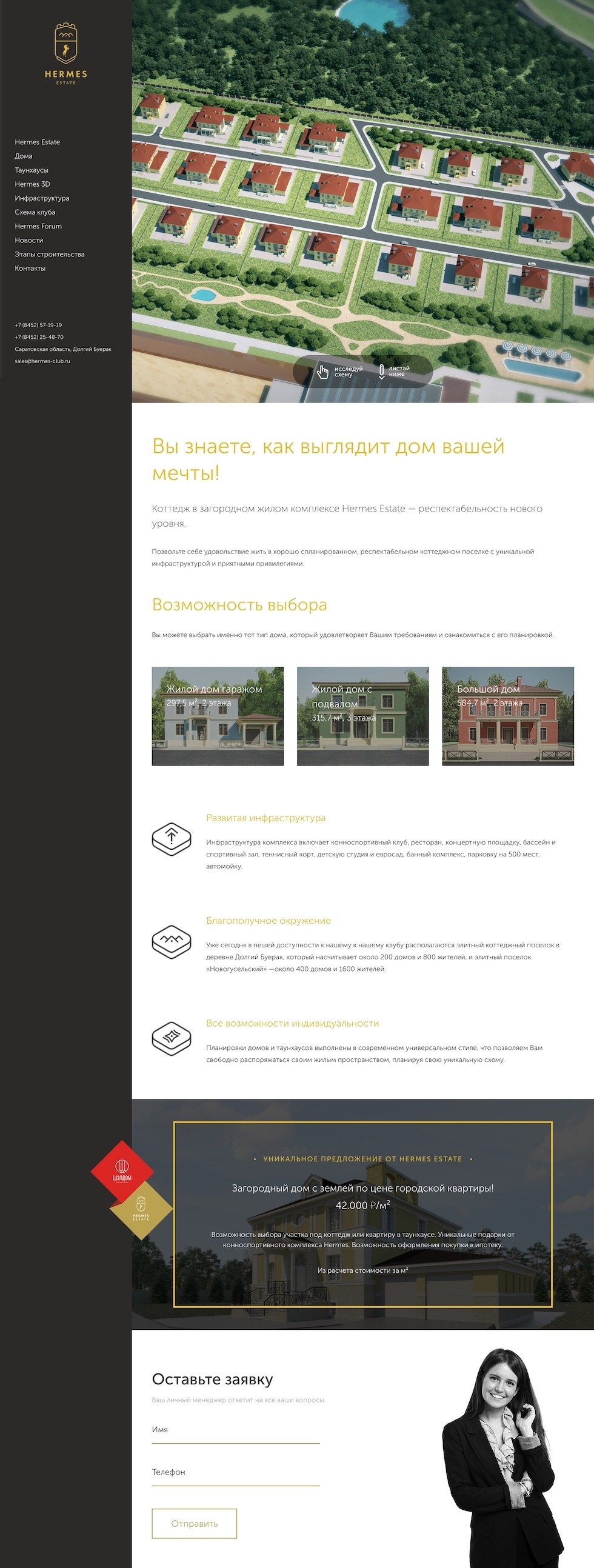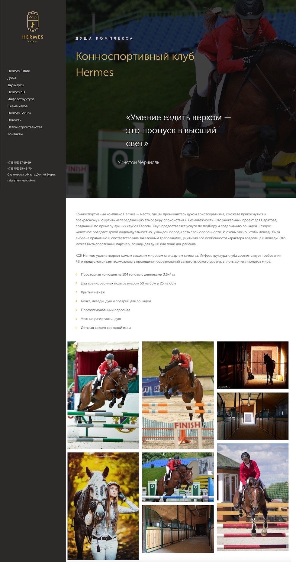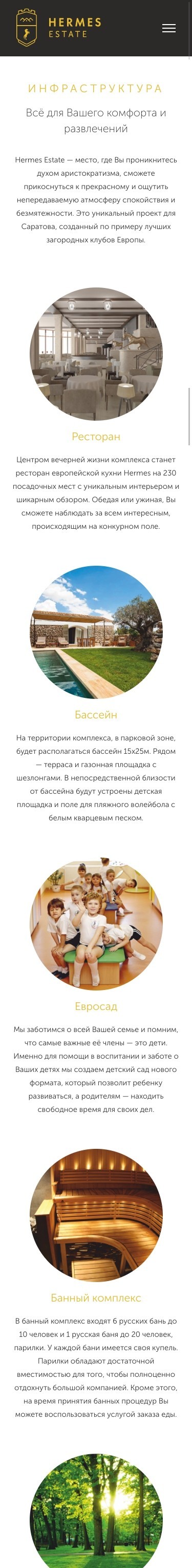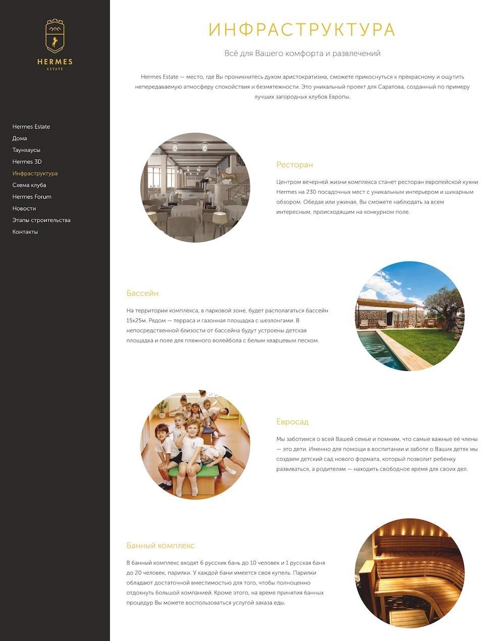 Hermes Estate уникальное явление для Саратова — на общей территории разместился коттеджный посёлок, конноспортивный клуб и другие объекты инфраструктуры: ресторан, гостиница банный комплекс, детский клуб.