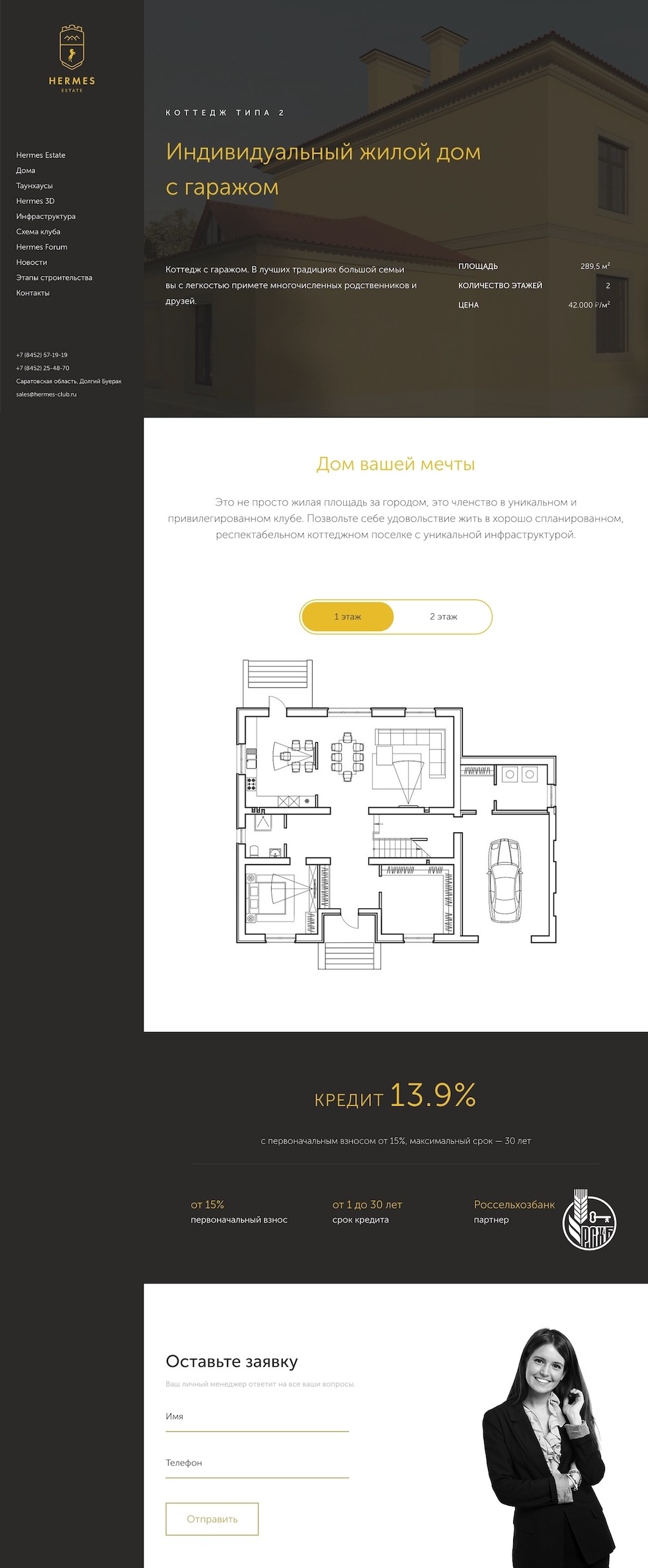 На главной странице 3D-схема с эффектными анимациями перехода между таунхаусами и коттеджами.