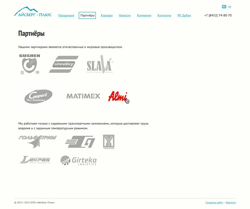 Партнёры представлены монохромными логотипами, окрашивающимися при наведении.