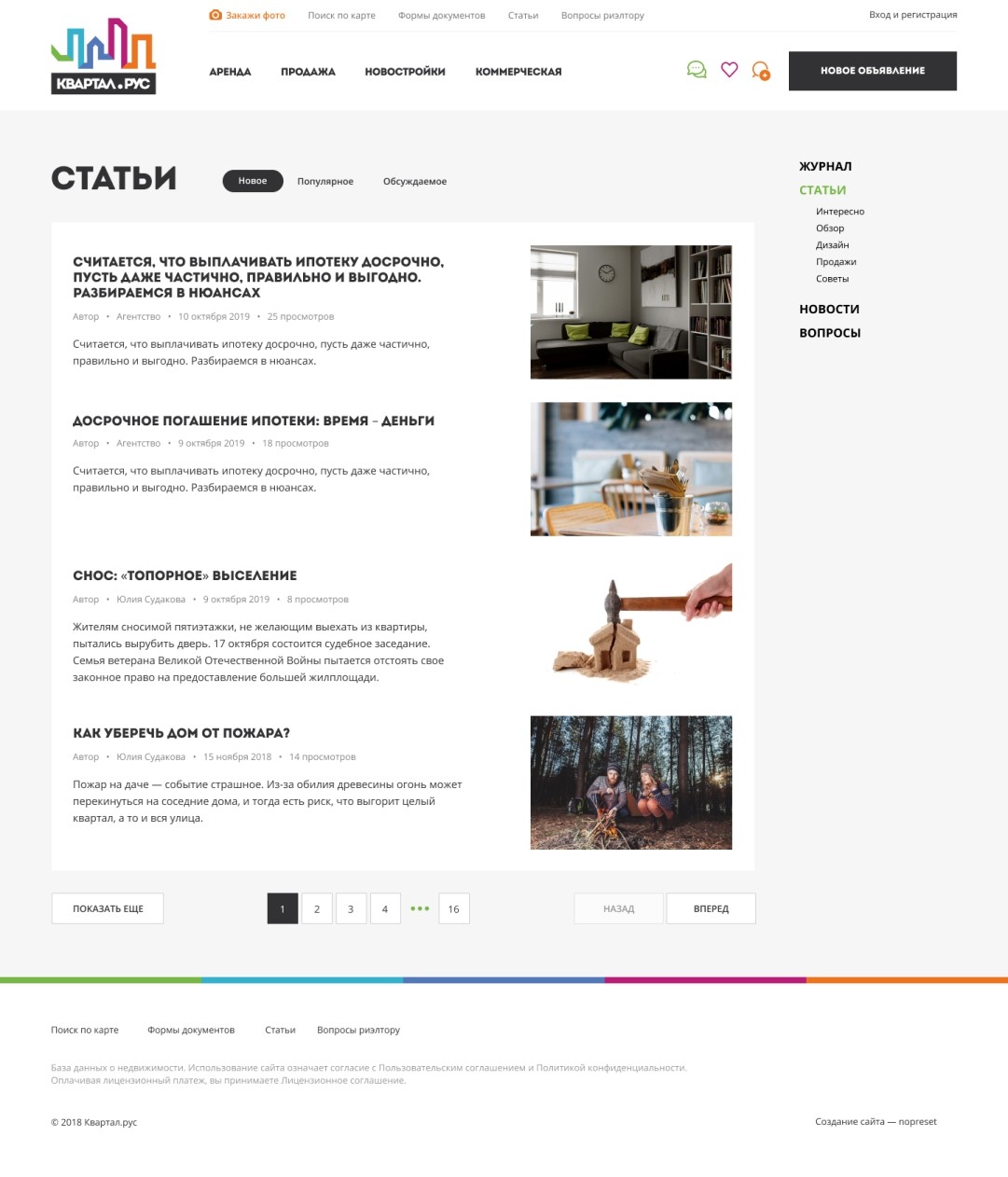 Кроме основных страниц с объявлением, также разработаны разделы статей, база типовых документов, раздел вопрос-ответ.