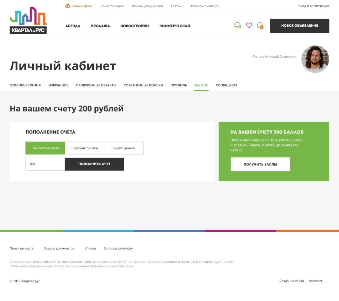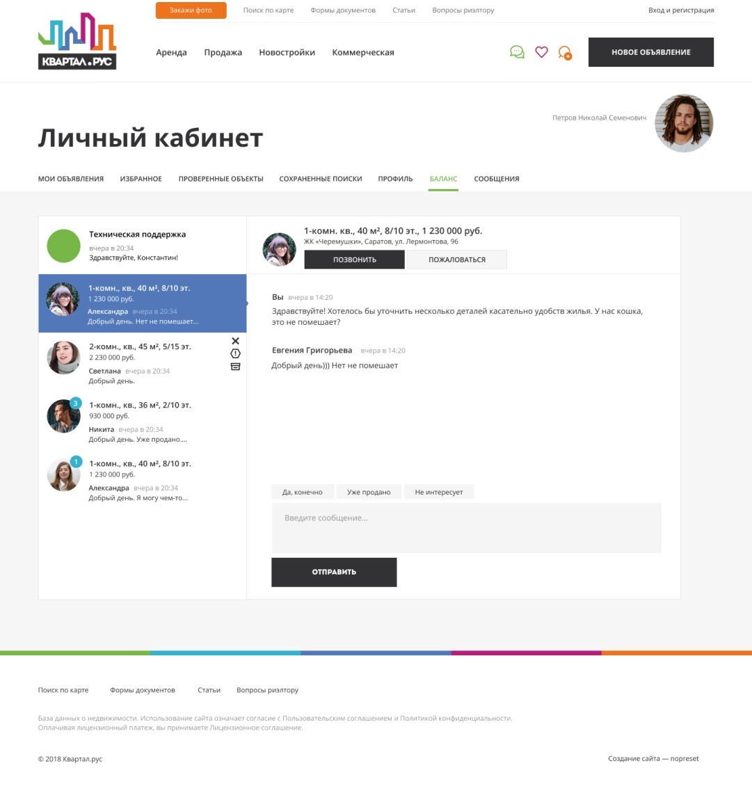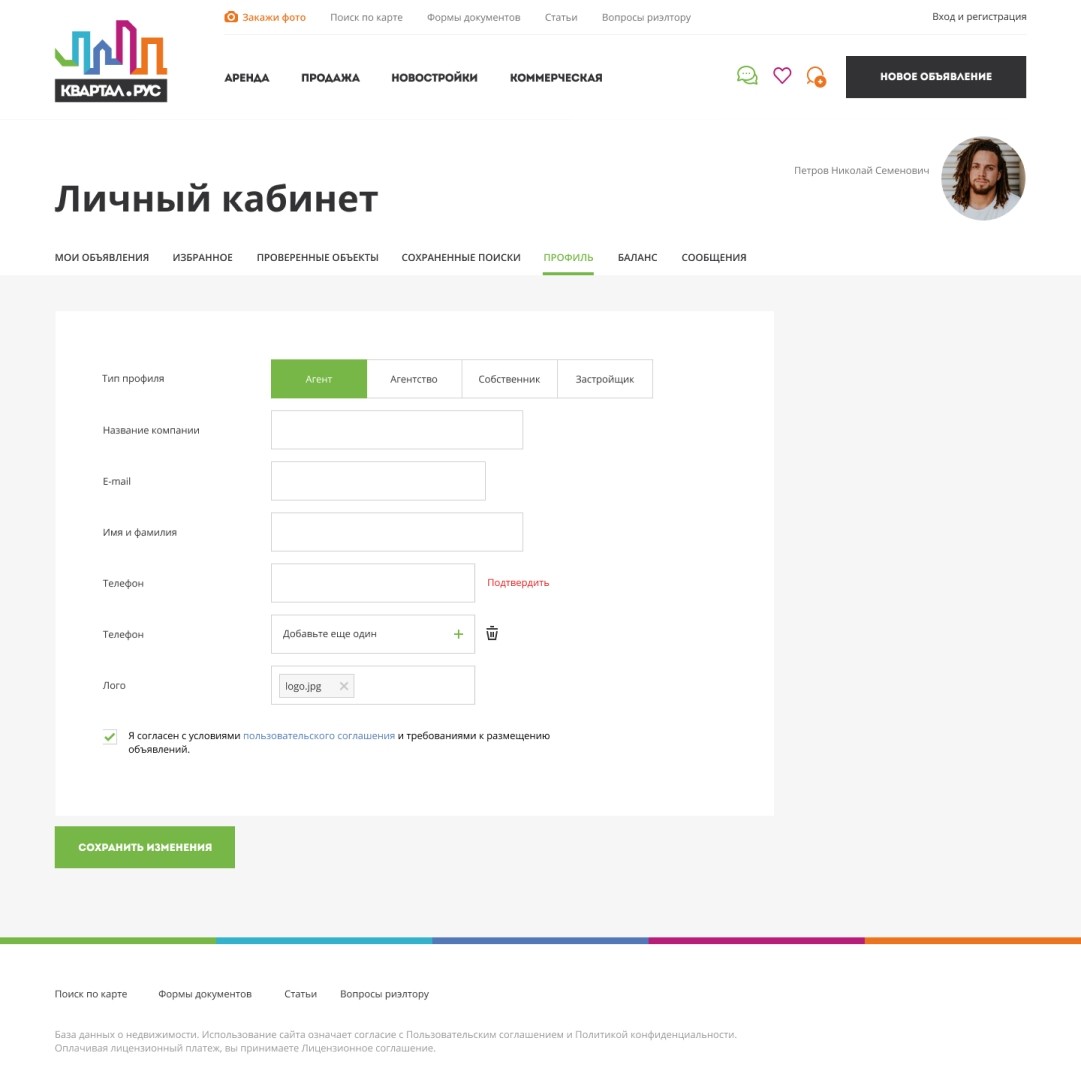 Кабинет содержит несколько представлений в зависимости от типа пользователя: агент, агентство, собственник, застройщик. Они влияют на способы и возможности размещения объявлений.