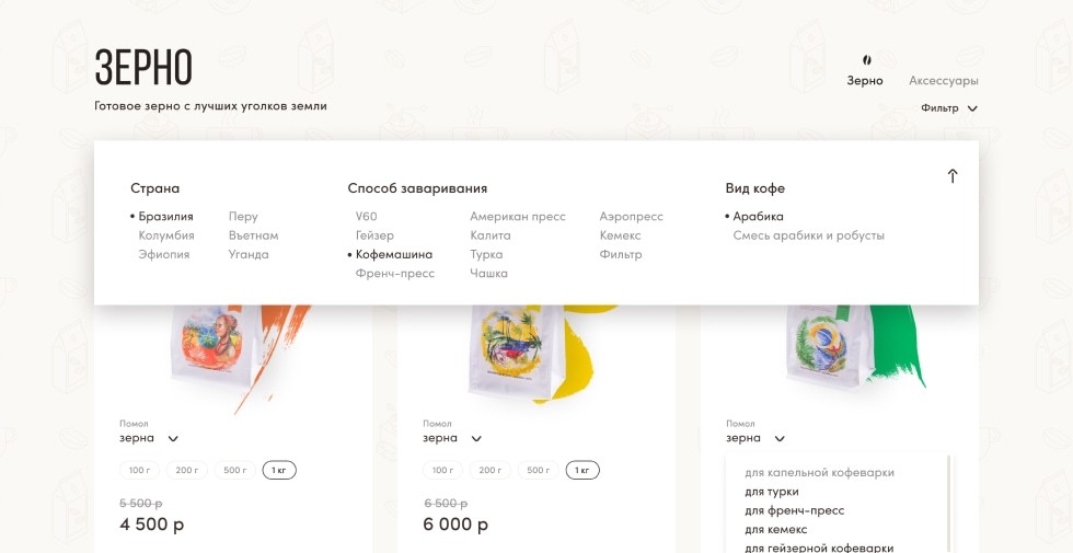 Для удобства подбора вкуса сделан фильтр по странам и типам кофе.