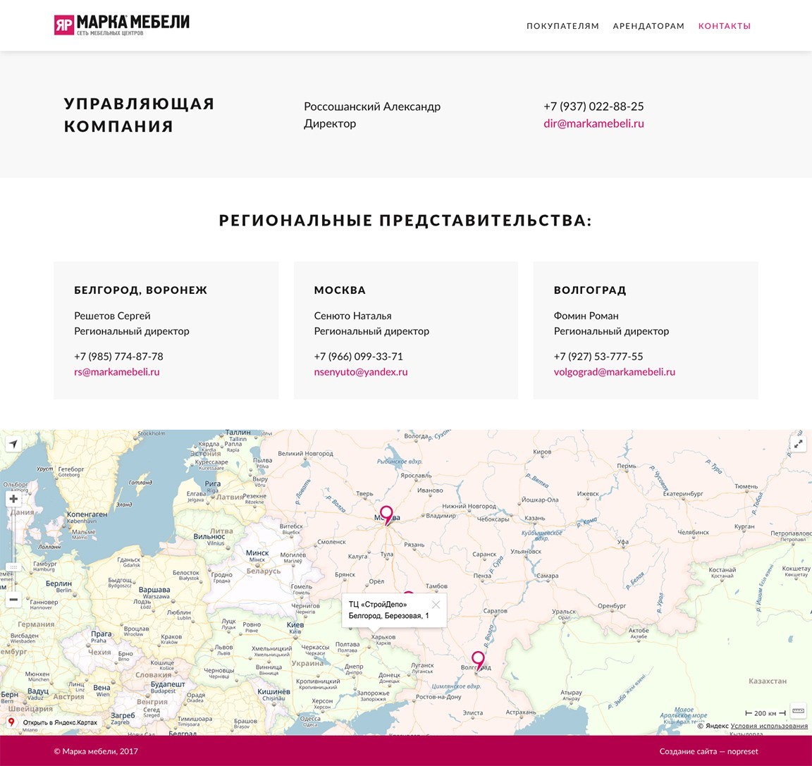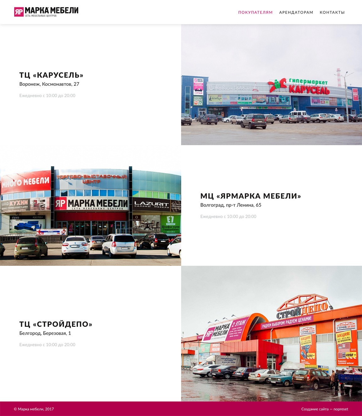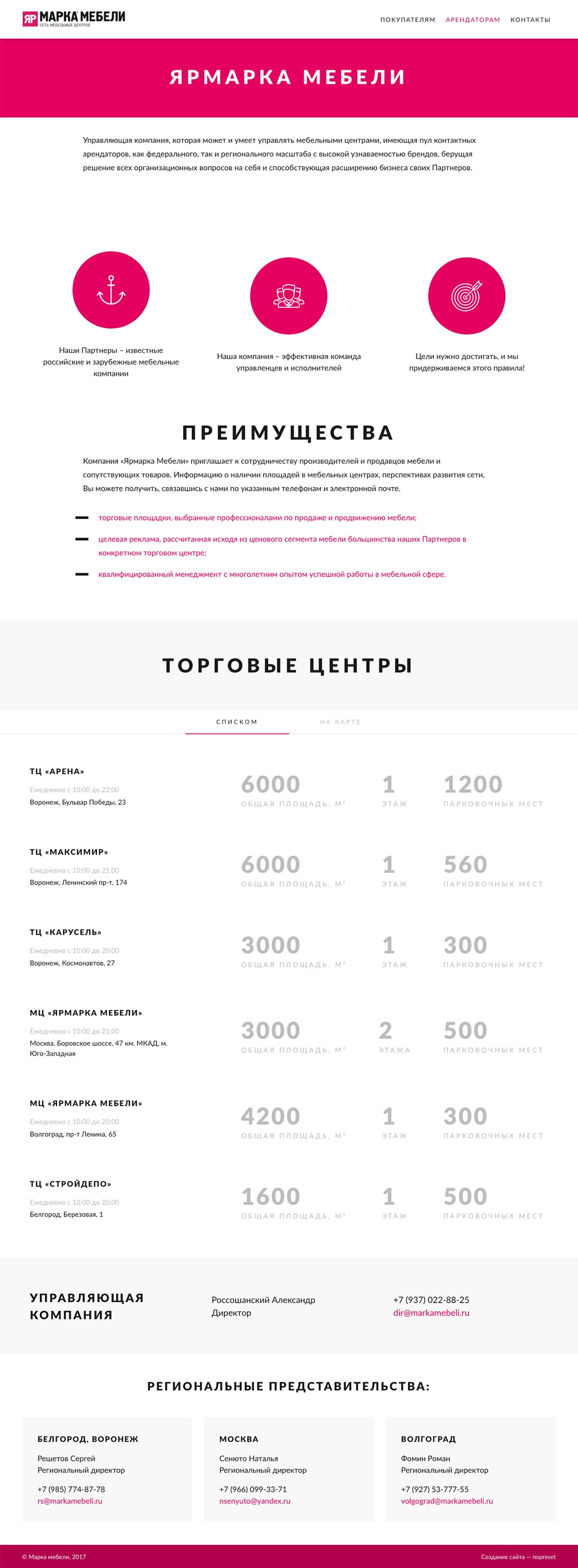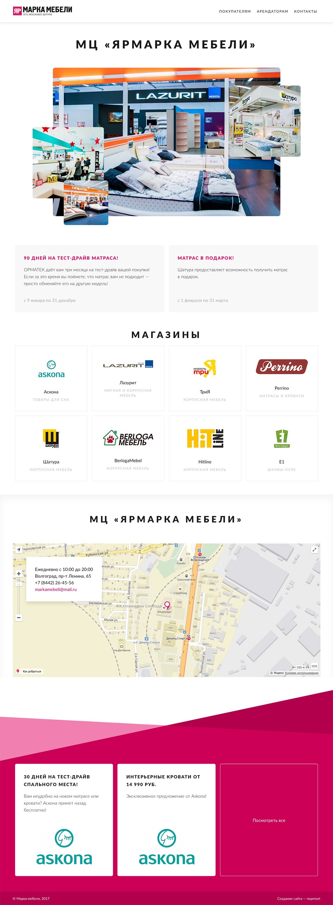 На сайте федеральной сети мебельных торговых центров размещена информация о всех центрах сети, магазинах и акциях, а также информация для арендаторов.