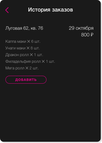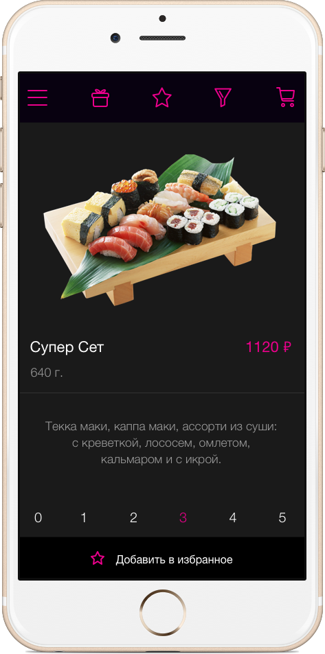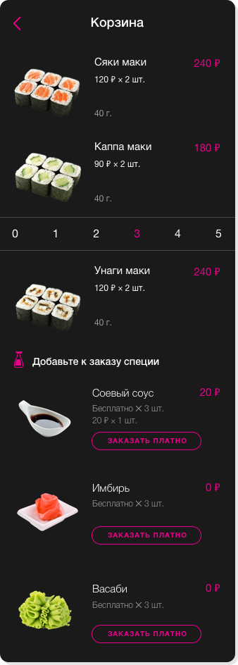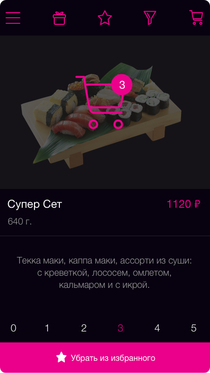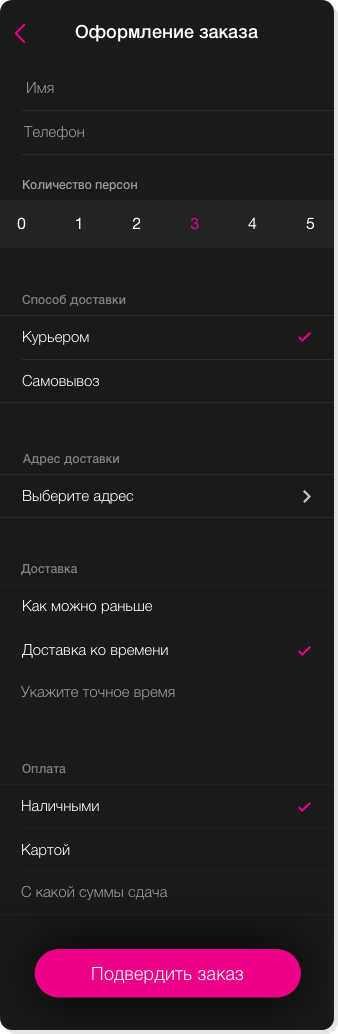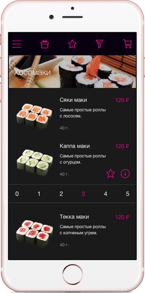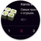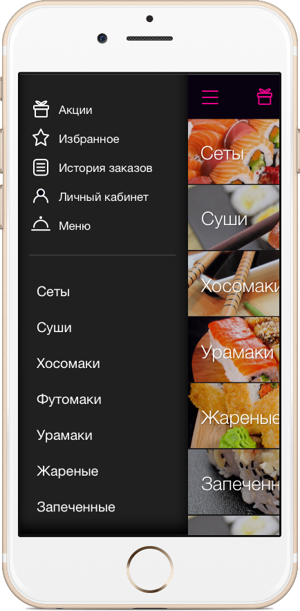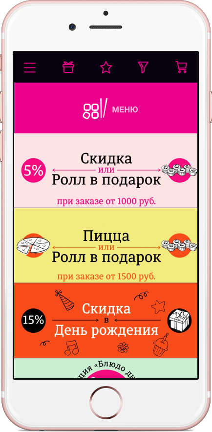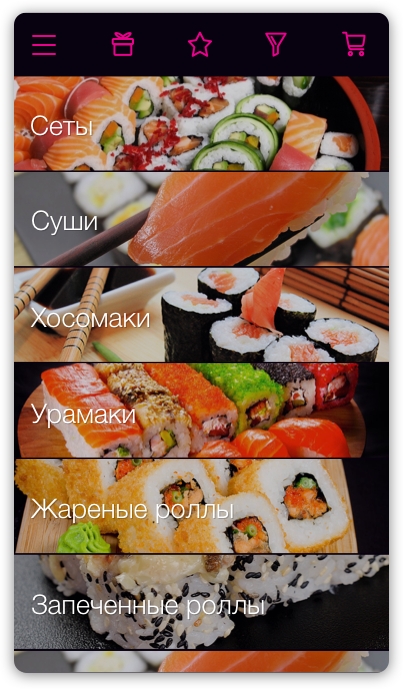 Категории меню перелистываются свайпом по заголовку, без использования бургер-меню.