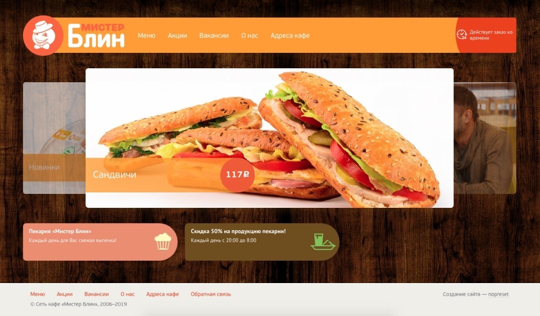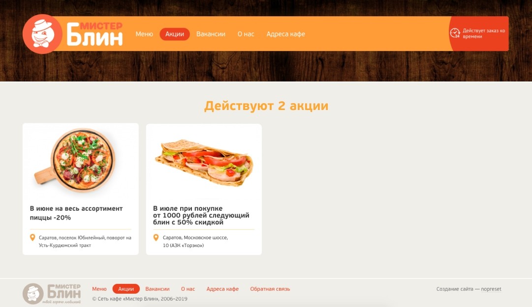 На главной показали основные акции и дополнительные фишки сети.