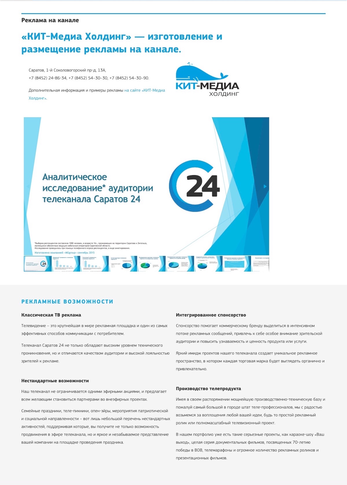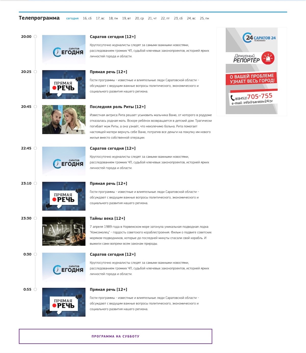 Телепрограмма синхронизируется со сторонним сервисом. Дополнительно оформлены несколько текстовых страниц сайта.