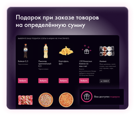 Помимо бонусной системы, покупатели могут получить подарок при заказе товаров на определенную сумму. Для этого на сайте установлен счетчик, который показывает, на какую сумму осталось добавить товаров, чтобы получить этот подарок