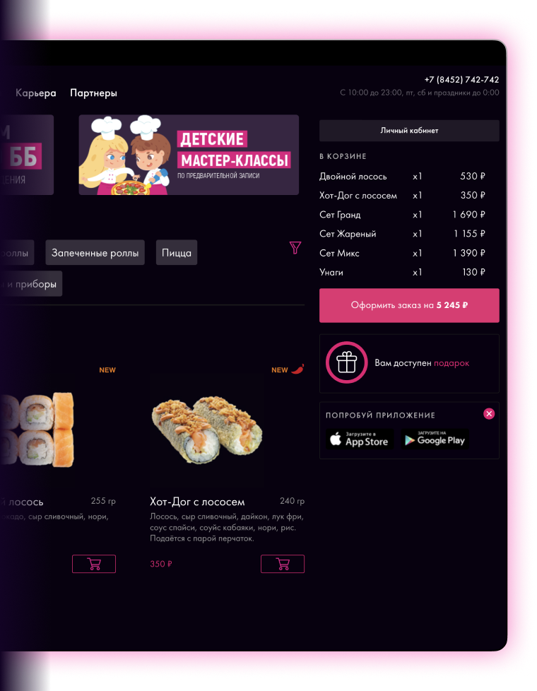 Сейчас приложение и сайт Саюри находятся на нашей поддержке, а также мы работаем над интеграцией с с iiko — системой автоматизации заказов для ресторанов. Кроме того, создаём функционал для гибкого управления зонами доставки в моменты пикового спроса и включения платной доставки в отдалённые районы.