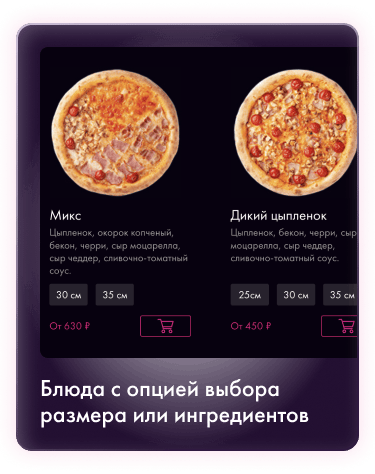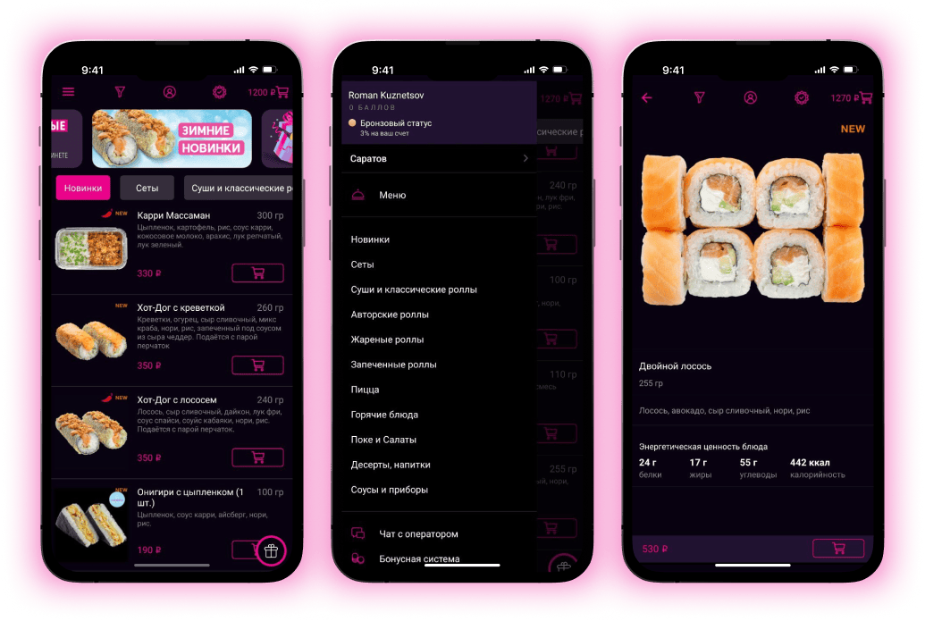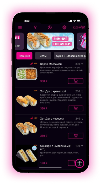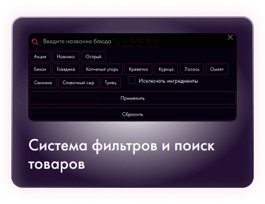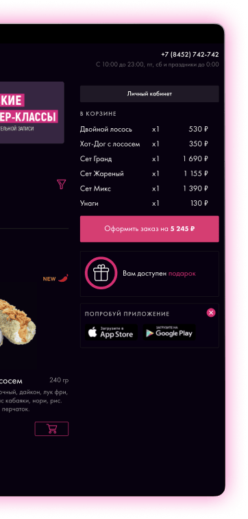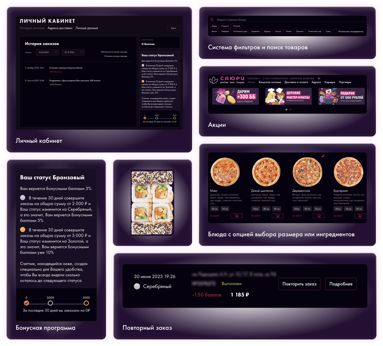 Когда приложение и сайт были запущены, мы занялись развитием проекта. Разработали личный кабинет, собственную платформу с бонусной программой, добавили акции. Появилась система фильтров и поиска товаров. Для удобства покупателей добавили функцию повторного заказа и возможность смотреть меню не только для доставки, но и для самовывоза. В меню также добавились блюда с опцией выбора размера или ингредиентов.