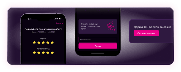 Заказы на сайте оцениваются по 5-бальной шкале, а приложение отправляет пуш-уведомления с напоминанием оставить отзыв.