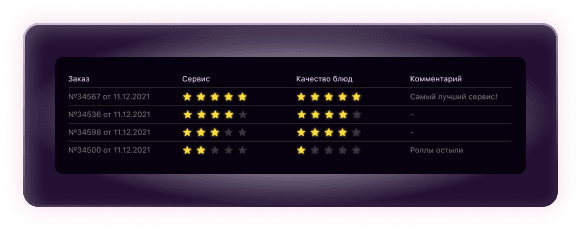 Для обработки оценок заказов и обратной связи службой качества реализована CRM