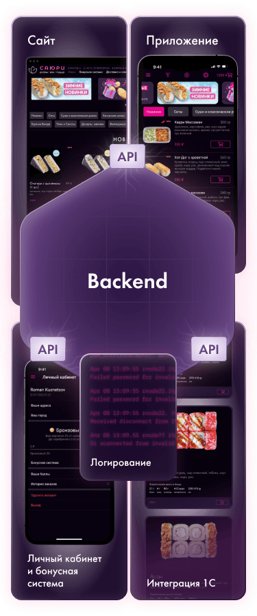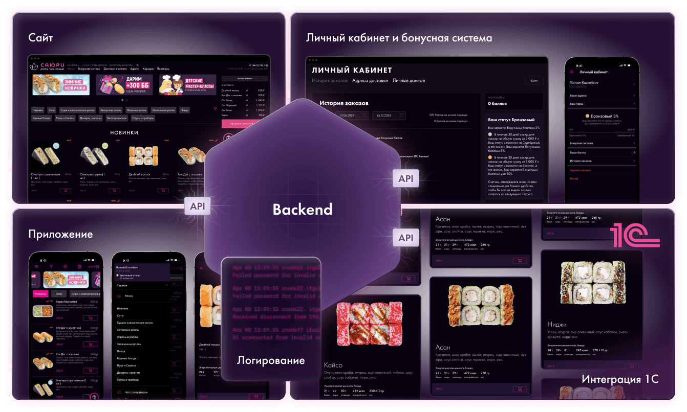 Сайт и приложение работают по API как клиенты, а остальная логика реализована на бэкенде. Личный кабинет и бонусная система имеют своё API, которое защищено от атак извне. Действия подробно логируются для оперативного выявления проблем и имеют гибко настраиваемые лимиты. Для каталога товаров мы реализовали интеграцию с 1С.