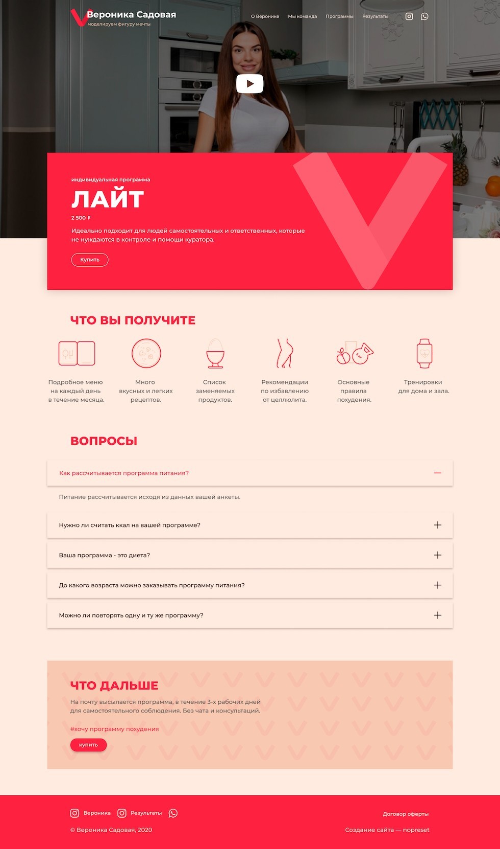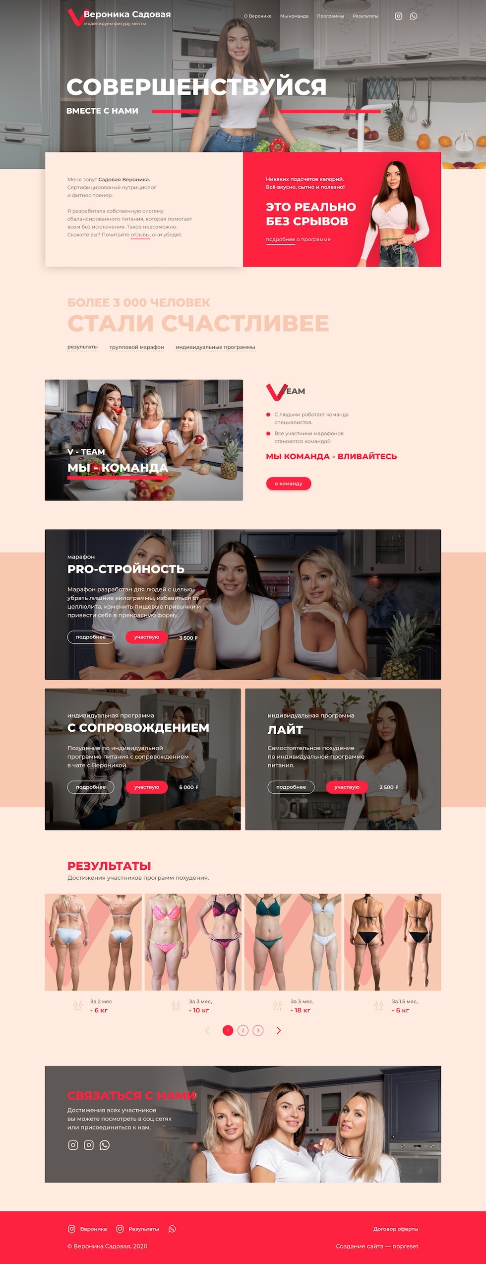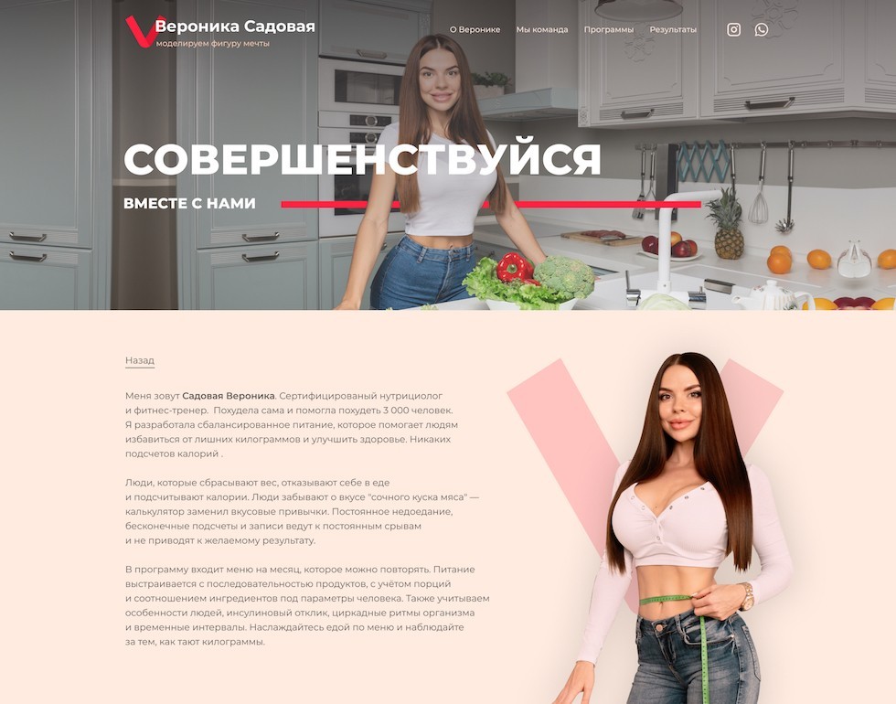 Для Вероники разработали три не похожие друг на друга дизайн-концепции. Выбор был сделан в пользу концепции, которая удачно презентовала ее бренд и рассказывала о возможностях программ питания.