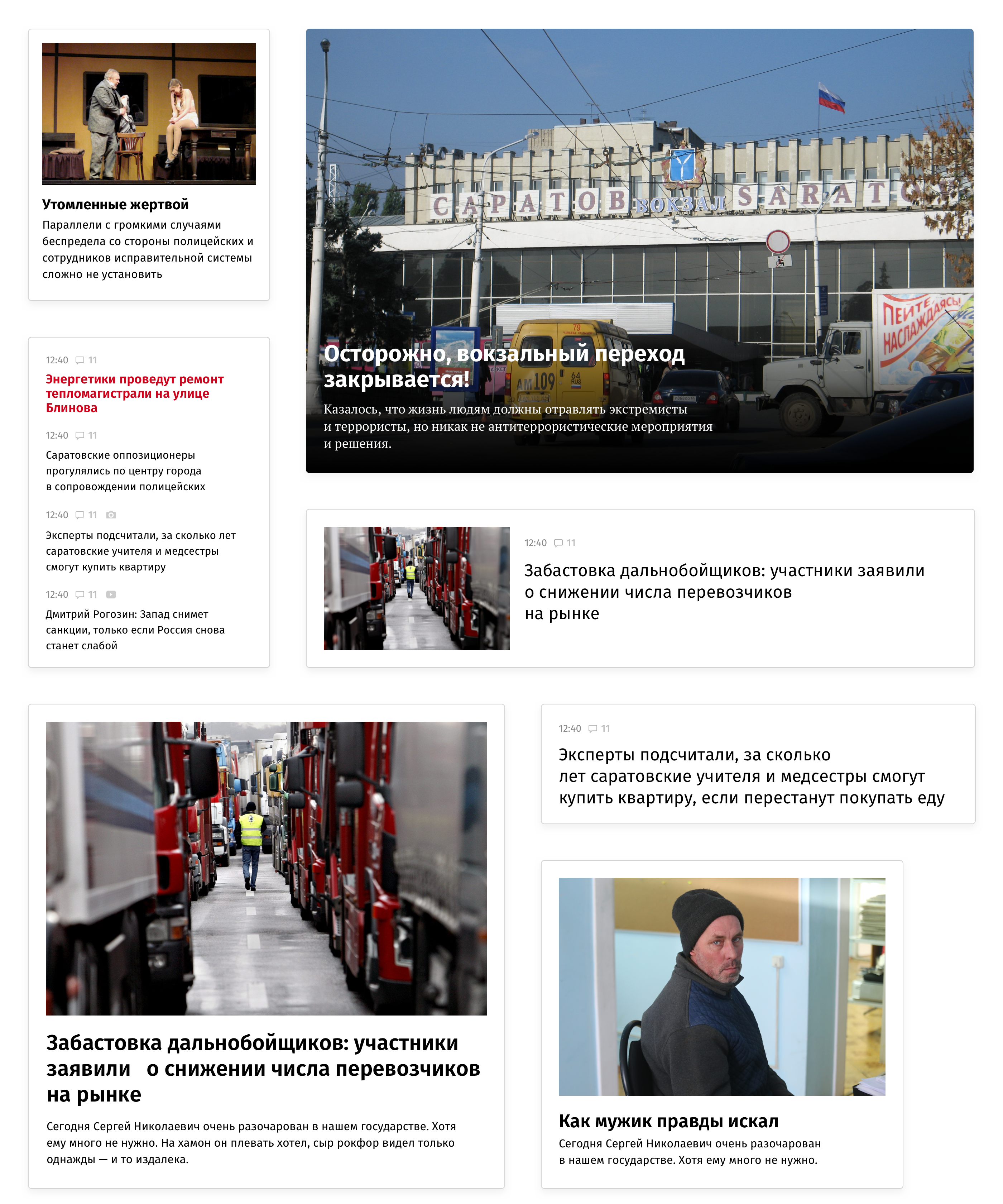 Главная страница собранна из двух частей: лента последних новостей и редакционных материалов. Важные события выделены формой или ярким красным цветом, а менее важные сгруппированны в текстовые блоки.