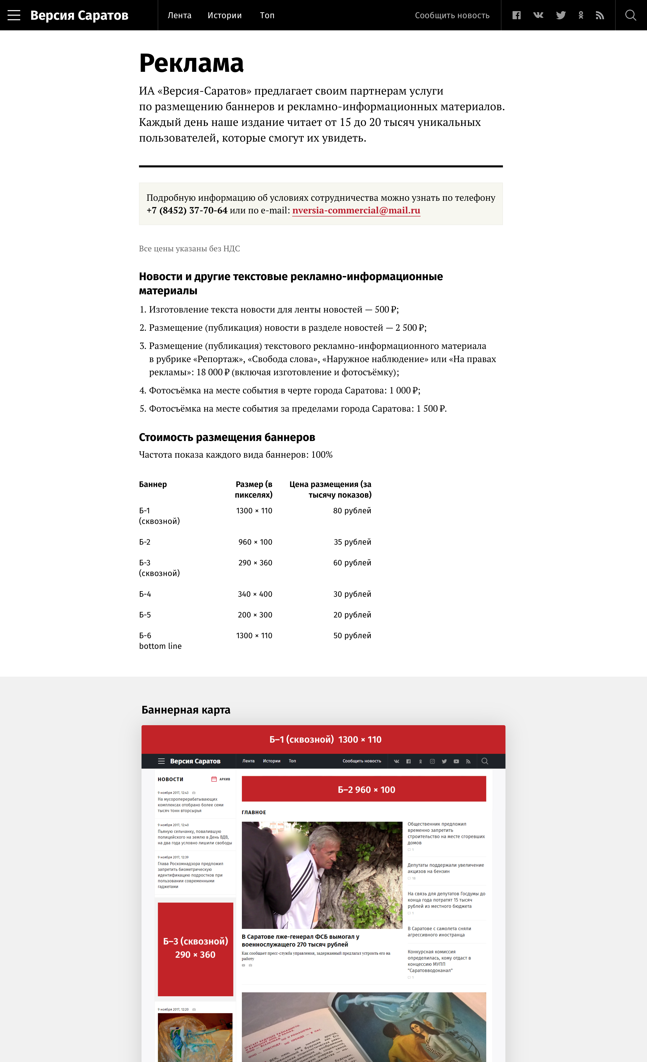 Баннеры – важная статья доходов для любого медиа. Мы постарались предусмотреть все необходимые форматы и их корректное отображение на популярных устройствах. Для удобства все варианты собраны и проиллюстрированы на странице рекламы.